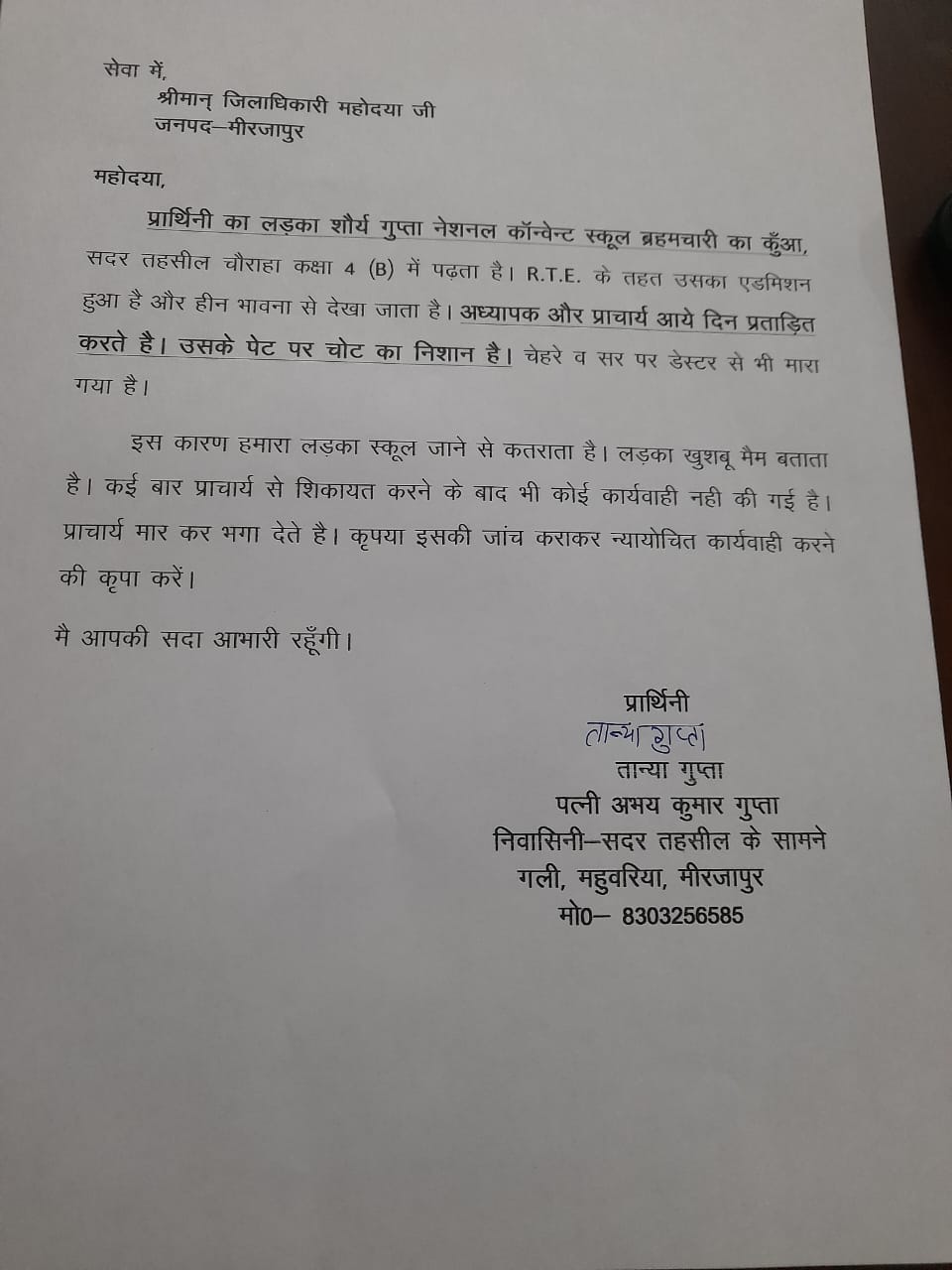 मीरजापुर – नेशनल कॉन्वेन्ट स्कूल, ब्रहमचारी का कुआं, सदर तहसील चौराहा में कक्षा 4 (B) के छात्र शौर्य गुप्ता, जो RTE के तहत दाखिल है, के साथ शिक्षकों और प्राचार्य द्वारा प्रताड़ना का मामला सामने आया है। छात्र की मां तान्या गुप्ता ने जिलाधिकारी को पत्र लिखकर शिकायत की है कि उनके बेटे को हीन भावना से देखा जाता है और शिक्षकों द्वारा मारपीट की जाती है। तान्या ने बताया कि शौर्य के पेट पर चोट के निशान हैं और चेहरे व सिर पर डेस्क से प्रहार किया गया है। शिक्षिका खुशबू मैम द्वारा प्रताड़ना की बात सामने आई है। प्राचार्य से शिकायत के बावजूद कोई कार्रवाई नहीं हुई, उल्टे उन्हें भगा दिया गया। इससे बच्चा स्कूल जाने से डरता है। तान्या ने जिलाधिकारी से जांच और न्यायोचित कार्रवाई की मांग की है।