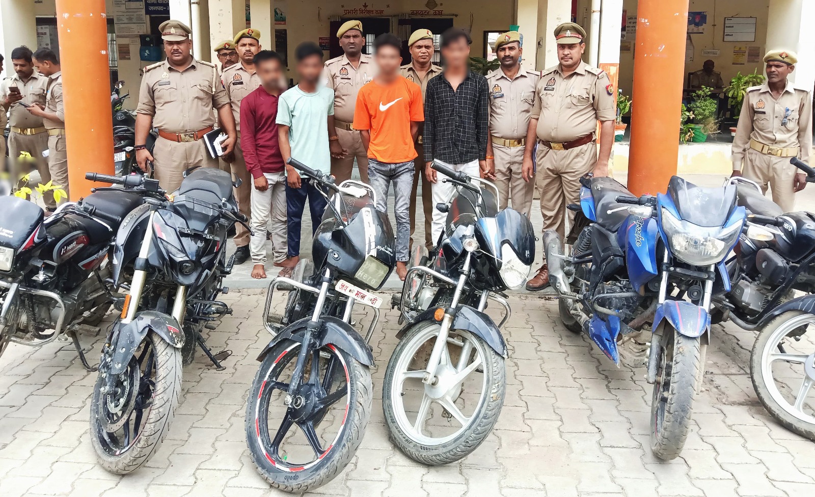 अपर पुलिस अधीक्षक नगर व क्षेत्राधिकारी नगर के नेतृत्व में थाना को0शहर पुलिस टीम को बड़ी सफलता हाथ लगी है। दिनांकः10.07.2025 को थाना को0शहर पुलिस टीम को जरिए मुखबिर सूचना प्राप्त हुई कि सखौरा में कुछ लोग चोरी के मोटरसाइकिलों की खरीद फरोख्त की बात की जा रही है। उक्त सूचना पर थाना को0शहर पुलिस टीम द्वारा दबिश देकर सखौरा से 04 अभियुक्तों 1.आकाश शर्मा पुत्र केदारनाथ शर्मा निवासी फतहां थाना को0शहर जनपद मीरजापुर, 2.विजय यादव उर्फ नन्ही पुत्र सुशील यादव निवासी सखौरा थाना को0शहर जनपद मीरजापुर, 3.सौरभ साहनी पुत्र अमृत लाल साहनी निवासी भटौली थाना को0देहात जनपद मीरजापुर, 4.विशाल विश्वकर्मा पुत्र गुलाब विश्वकर्मा निवासी सखौरा थाना को0शहर जनपद मीरजापुर को पकड़ा गया तथा मौके से चोरी की 06 मोटरसाइकलें(बिना नम्बर प्लेट) बरामद की गयी। गिरफ्तार अभियुक्त विशाल विश्वकर्मा उपरोक्त के कब्जे से एक अवैध तमंचा 315 बोर व एक अदद जिंदा कारतूस भी बरामद हुआ। उक्त गिरफ्तारी व बरामदगी के सम्बन्ध में थाना को0शहर पर मु0अ0सं0-137/2025 धारा 317(2),317(4),317(5) बीएनएस व 3/25 आयुध अधिनियम पंजीकृत कर नियमानुसार अग्रिम विधिक कार्यवाही करते हुए गिरफ्तार अभियुक्तों को जेल भेजा गया। बरामद 06 मोटरसाइकिलों के चोरी हो जाने के सम्बन्ध में जनपद मीरजापुर के थाना को0शहर-01 , थाना को0देहात-02 , थाना कछवां-01 व जनपद वाराणसी में 01 चोरी का अभियोग पंजीकृत है जिससे सम्बन्धित मोटरसाइकिलें बरामद की गयी है जबकि शेष एक मोटरसाइकिल के सम्बन्ध में जानकारी की जा रही है।