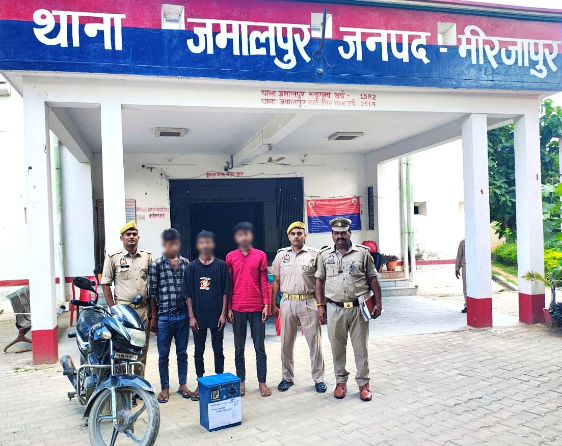 थाना जमालपुर, जनपद मीरजापुर पर दिनांकः25.09.2025 को वादी सुमित सिंह पुत्र स्व0कुश सिंह निवासी भदावल थाना जमालपुर जनपद मीरजापुर द्वारा अज्ञात चोरों के विरूद्ध मोटर पम्प का 5 केवी का स्टेबलाइजर चोरी हो जाने के सम्बन्ध में लिखित तहरीर दी गई। उक्त के सम्बन्ध में प्राप्त तहरीर के आधार पर थाना जमालपुर पर मु0अ0सं0-159/2025 धारा 303(2) बीएनएस पंजीकृत कर विवेचना प्रारम्भ की गई। वरिष्ठ पुलिस अधीक्षक मीरजापुर द्वारा उक्त घटना को गंभीरता से लेते हुए क्षेत्राधिकारी चुनार के नेतृत्व में अभियुक्तों की गिरफ्तारी व बरामदगी हेतु थानाध्यक्ष जमालपुर को निर्देश दिए गए। उक्त निर्देश के अनुक्रम में थाना जमालपुर पर पंजीकृत उपरोक्त अभियोग में पतारसी सुरागरसी व अग्रिम विवेचनात्मक कार्यवाही करते हुए दिनांकः26.09.2025 को उप निरीक्षक अजय कुमार सिंह मय पुलिस टीम द्वारा प्राप्त मुखबिर सूचना के आधार पर थाना जमालपुर क्षेत्रान्तर्गत औरैया मोड़ के पास से मुकदमा उपरोक्त से सम्बन्धित मोटरसाइकिल सवार 03 अभियुक्तों 1.आशीष यादव पुत्र नन्दलाल यादव निवासी भदावल थाना जमालपुर जनपद मीरजापुर, 2.मनोज कुमार पुत्र राजकुमार, 3.अजय कुमार पुत्र मुन्नालाल बियार निवासीगण सिकरा (ओड़ी) थाना जमालपुर जनपद मीरजापुर को गिरफ्तार किया गया। मौके से चोरी का एक इलेक्ट्रानिक स्टेबलाइजर 5 केवी बरामद किया गया और मोटरसाइकिल को अन्तर्गत धारा 207 एमवी एक्ट में सीज किया गया। गिरफ्तार अभियुक्तों के विरुद्ध नियमानुसार अग्रिम विधिक कार्यवाही करते हुए जेल भेजा गया।